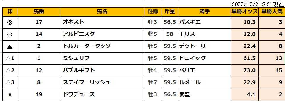 ボンジュール昨日 予告した通り 凱旋門賞のシルシトカイメをドン日本馬に勝ってほしい気持ちは ヤマヤマですが、ガチ予想では、日本馬を軸にする勇気はありませんでした。本命は かつてディープインパクトが出走した2006年凱旋門賞の勝利ジョッキーのパスキエが騎乗するオネストをチョイスしました。オネストの戦績を見ると、今回と同じロンシャンでパリ大賞典を勝って凱旋門賞に出走というのもレイルリンクと似ていて、日本馬の壁として立ちはだかるのかなと思い、日本馬へのひいき目抜きで本命にチョイスしました。対抗はジーワン連勝中の葦毛の牝馬 アルビニスタをチョイスしました。葦毛が好きだからというだけの理由です。その他は、抑えとして中東ジーワンでがっぽり稼いだミシュリフ、昨年の凱旋門賞馬トルカータタッソ、そしてかつて日本で活躍した 禿・・ではなくペリエさん騎乗のバブルギフトをチョイスしました。日本馬からはステイフーリッシュとドウデュースをチョイスしました。単純にマイ馬券に相性のいい 武豊さんとルメール君だからというだけの理由です。カイメは・・・①日本馬を外したガチ馬券。②対抗・本命の2頭軸の「ほぼ」総流しのガチ馬券。 ※①②でオッズが低い買い目の買い足し③ドウデュースとステイフーリッシュを軸とした応援馬券。④対抗・本命を1・3着候補、2着はシルシ馬のフォーメーションとしたガチ馬券。⑤ドウデュースの勝ちを想定したガチ半分・応援半分馬券で・・・・ある数字が一つだけなく・・・それは11番のタイトルホルダー。買ったら来ないし、買わなかったら来るという、なんとまぁ天邪鬼な馬ですが、奴にも頑張って、勝ってほしい気持ちはあります。なので、ここはもう、敢えて馬券買わないことで、勝ちを応援したいと思います。という感じの2022年凱旋門賞予想でした。それでは、まずはスプリンターズステークス楽しみましょうってことで・・気が向いたら、今日のどこかで現れます。それではまた。