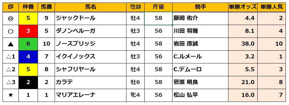 お疲れさんです。昨日は有給取ったので、3連休の中日です。時間ないので、短縮版にて。ジスサンデーのジーワンは、秋の中距離王を決める 天皇賞秋ですか。3歳馬の一線級どころを中心に、古馬勢が虎視眈々と狙っている感じですが・・それではシルシトカイメをドン。10月30日の天皇賞秋と言えば・・・2016年10月30日の天皇賞勝ち馬はモーリス・・・そして、モーリス産駒と言えば、ジャックドールとノースブリッジどちらも逃げ馬と言われつつ、番手でもレースを進めて結果を出している点を評価して、シルシを付けました。3歳馬からは、共同通信杯勝ち馬のダノンベルーガを軸にチョイスしました。1番人気ダービーでは、2400Mの距離が敗因で4着で、今回の府中2000Mはベスト舞台と思ったので、2番手評価としました。ダービー後に脚の故障があったジオグリフとイクイノックスは、、回復具合がどうかなというところで、評価を下げて、ジオグリフは消し、イクイノックスは抑えまでとしました。その他穴っぽいところで、新潟記念の勝ち馬カラテと、小倉記念勝ち馬のマリアエレーナの内枠2頭をチョイスしました。カイメは、3連複を中心に、トリガミっぽい買い目は買い足しました。という感じの天皇賞秋予想です。これが終われば、1週間のブランクがあり、再来週のエリザベス女王杯ですか・・・本命は・・・・もちろん・・・・また、別の話まで・・・・焦らずに・・・・・考えたいと思います。まずはメンバーチェックからですね。それでは、ザ・サタデー・アフター・ネクストのどこかで現れる予定です。今日はこの辺で・・アディオス