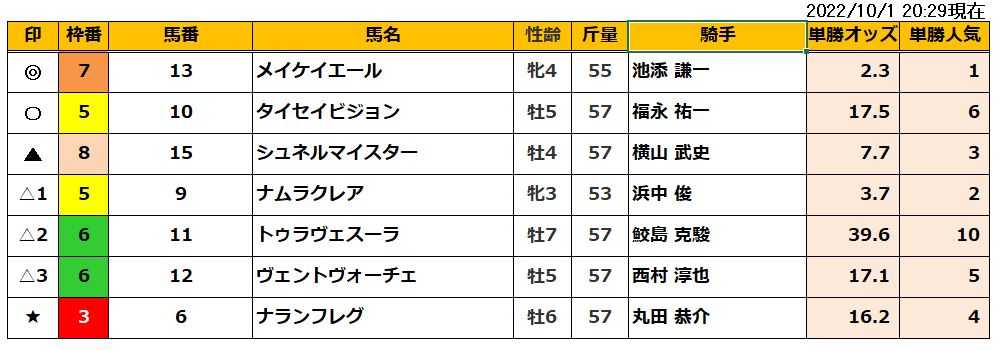 ご無沙汰しております。今年のサードクォータシーズンも終わり、もう10月・・ラストクォータシーズン突入ですか。毎年この時期思うのですが、時の流れの速度が毎年早く感じるのは私だけではないはずと思うこの頃。この時期といえば・・半袖率が少しずつ減って、長袖率が上がる時期。プロ野球の順位もほぼ確定しつつある時期。20年目を迎える某刑事ドラマがもう少しで始まる時期。などなど、色々ありますが・・・何と言っても、競馬の秋ジーワンシーズンが始まる時期なんですよ。ということで、ジスサンデーケイバ行ってみましょうか。秋ジーワンの第一弾といえば・・・中山の電撃戦 スプリンターズステークスですか。メンバーは小粒感が否めずという感じですが・・・優勝賞金が1億7000万円に上がったってことで、陣営のモチベーションも上がり、エキサイティングなレースが期待できると思うのですが・・それでは、シルシトカイメを行ってみましょ。ドン本命は、素直に1番人気のメイケイエールをチョイスしました。馬番発表の時にこれと決めてました。振り返ること4か月前の安田記念。マイケイバ歴で馬券的中がなく、池添君騎乗の13番のソングラインを本命にして、ミゴツマンバケンゲッツしたのですが・・同じく馬券的中がない今回のスプリンターズステークスで、池添君騎乗のメイケイエールが、マイラッキーナンバーの13番を引いたので、ここは本命にしないわけには行かんでしょうということで、この辺のシルシとなりました。今年の春ジーワンで勝ちがない1番人気濃厚ですが、そんなん打ち破ってくれるでしょう。対抗は2番人気の3歳牝馬・・・ではなく、カキコ現在6番人気で、ダービージョッキーの福永君騎乗のタイセイビジョンをチョイスしました。昨年もこのレースに出て11着と惨敗でしたが、出遅れで上り3ハロンが最速だったので、出遅れがなかったら馬券圏内は来てたでしょうと。6戦して1200Mは4戦して全て2着とパーフェクト連対。1着は斤量のハンデにも恵まれていたので、実質勝ちと見ていいでしょうと。メンバー随一の実力と見ていいでしょうということで、この辺のシルシとなりました。3番手に2番人気の3歳牝馬・・・ではなく、NHKマイルカップ勝ち馬のシュネルマイスターをチョイスしました。この馬の取捨選択に迷い、前走と同じルメール君なら迷うことがなかったのですが、マイ馬券と相性がいいルメール君はフランス遠征で、ピンチヒッターは横山武君になり、マイ馬券との相性が悪い(横山一族はみんな相性が悪い・・)ので、どうしようかな~と迷ったのですが、安田記念でマンバケンゲッツでお世話になったので、もう一丁よろしくお願いしますということで、この辺のシルシとなりました。2番人気の3歳牝馬ナムラクレアは4番手評価となりました。桜花賞3着から、夏ケイバの短距離路線で2戦して、1着3着と好走してはいるところから、2番人気に押し上げられてますが、そこと比べるとさすがにメンバーは強化されており、軸に据える勇気はなかったというところで、この辺のシルシとなりました。抑えに、6枠2頭の トゥラヴェスーラとヴェントヴォーチェをチョイスしました。トゥラヴェスーラは、春のスプリントジーワン高松宮記念では本命に据えたのですが結果4着。この予想していた時は、高松宮記念の優勝賞金が上がったことに気づかずに予想してたので、気づいていたら、ジョッキーの勝負強さを懸念して評価を下げてました。そして今回は優勝賞金が上がったことを考慮して、他のジョッキーのモチベーションが上がり、若手ジョッキーの鮫島君では荷が重いかなというところでこの辺のシルシとなりました。ヴェントヴォーチェは、リステッドレースながら、今回対抗のタイセイビジョンに勝った実績があり、前走の重賞勝ちの実績もあるところで、シルシ馬にチョイスしました。最後の穴馬には、 ナランフレグをチョイスしました。8番人気で勝った高松宮記念と同じシルシです。ジーワン勝ちで、オッズ妙味が下がった今回、シルシをつけるかどうか迷ったのですが、昨年のセントウルS10着以降、1200Mでは、ジーワン勝ちも含めて全て3着以内で、シルシをつけない訳には行かないかなというところで、この辺のシルシとなりました。以上7頭のマイシルシ馬をチョイスしました。カイメは・・あまり高い配当は目指さず・・否少しは夢見的な買い目もありますが・・基本は堅めの買い目としてみました。これで、マイケイバ歴22年目にして、スプリンターズステークス馬券的中を目指したいと思います。とにかく当てたいんやと。これが終わったら・・・スプリンターズステークスデーのナイトと言えば・・海の向こうフランスで、凱旋門賞ですか。日本馬が4頭 参戦ということで、馬券購入もできるようで、今回はきっちり予想して買いたいと思います。という訳で、明日のどこかで 番外編としてカキコしたいと思います。予想というより、日本馬応援・