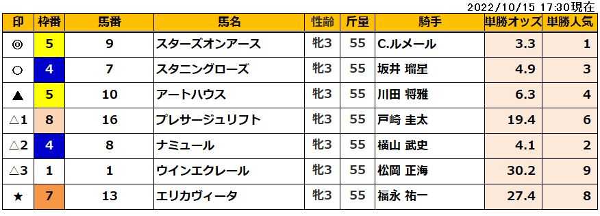 おつかれさんです。前回カキコから2週間たち、10月ももう後半戦、今年も残すところ2.5カ月ですよ。半袖率も前回カキコからさらに下がっているこの頃(・・といっても今はTシャツのみで書いてますが・・)そんなこんなで秋深まる今日この頃で、秋深まると言えば・・・秋ケイバのジーワンってことで、ジスサンデーケイバ行ってみましょうか。今回は、3歳牝馬ジーワンの3冠目のレース(厳密にはクラシックではないので・・)秋華賞ですか。一昨年に続き7頭目の三冠牝馬が誕生するか、それとも2冠で終わるか・・桜花賞とオークスを勝った馬を2010年以降で見ると、ジェンティルドンナ、アーモンドアイ、デアリングタクトと、すべて秋華賞も勝って3冠を取ってると。桜花賞とオークスを勝った馬が秋華賞で敗れたのは、2009年のブエナビスタまで遡るので、これだけ見ると、3冠牝馬の可能性は高いかなと。で、その3冠へ挑戦できる馬は、今回1番人気濃厚ですが・・今年のジーワンは1番人気がまだ勝ててないと来ている。マイ予想ではどっちを取るか・・俺の腹は決まってました。オークスの時点で。それでは、シルシトカイメをドン。本命は・・やっぱり、素直に牝馬三冠に挑戦するスターズオンアースでいいでしょう。桜花賞では7番人気で本命にチョイスし、それに応えてくれてミゴツに勝ち、マンバケンに貢献してくれました。オークスでは俺の浮気心で、シルシを外すという暴挙に出てしまい、そこでミゴツに勝たれてしまったので、反省し、また本命に指名させていただきました。対抗は、オークスと同じく スタニングローズをチョイスしました。オークスでは10番人気でしたが、前走重賞勝ちを評価し、対抗に指名し、ミゴツに2着で答えてくれたのですが、先ほど述べた浮気心で、馬券を外してしまったので、ここは一途になりたいと思います。対抗と本命は、オークスの時点で決めてたのですが・・3番手以下の馬のチョイスで、相当悩みました。3番手は、ローズステークス勝ち馬のアートハウスをチョイスしました。オークスは着外でしたが、4月の阪神2000Mのリステッドレースでの強い勝ち方が印象に残っており、前走のトライアルも快勝したというところで、この辺のシルシになりました。抑えには大外のプレサージュリフト、カキコ現在2番人気のナミュール、最内のウインエクレールをチョイスしました。上位人気の有力馬が真ん中の枠に集中したことで、これらが警戒しあって、内・外の馬がそろっと抜け出すことも考えられるかなというところでチョイスしました。穴馬にはエリカヴィータをチョイスしました。オークスでは浮気心で本命にしたのですが、・・一発あるとしたら、福永クン騎乗のこの馬になってしまいました。浮気心とはいえ、本命に指名した馬・・・頑張ってほしいというところで、この辺のシルシとなりました。カイメは・・基本は、本命のスターズオンアースを軸とした3連複・3連単を中心としましたが、トリガミが多くなってしまうので、マイ馬券と相性が悪い、横山武君のナミュールの買い目を薄くし、スターズオンアースが万が一俺の浮気を許してくれず、どこかに飛んでしまった時の保険で、スタニングローズ・アートハウスの三連複軸流しの買い目を追加しました。三冠牝馬が出るかどうかは別として、まぁ、今回の秋華賞は堅いかなという予想ですね。これが終われば、次は3歳牡馬・・こちらはクラシック3弾の菊花賞ですか。皐月賞馬は天皇賞秋、ダービー馬は凱旋門賞大敗→JC予定と・・そして皐月賞&ダービー2着馬が、ここに出るようなら鉄板級のシルシを打とうと思ってたところで、天皇賞秋という訳で・・・今年の春クラシックの勝ち馬と2着馬が、そろって不在の菊花賞ですが・・ここは馬券を楽しむ感じで行きましょう。本命は・・・もちろん・・・・別の話まで、焦らずにお待ちください。もう決まってます。それでは、またネクストサタデーナイトに現れます。アディオス_/_/~~