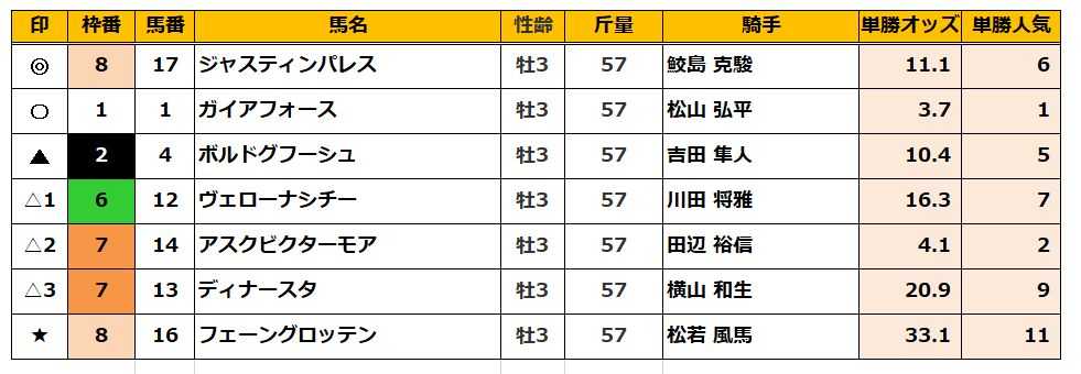 どうもです。10月も残すところ1週間余りですか。プロ野球も日本シリーズが始まったり、今週は冷房を一切使わなかったりなどと、先週から、更に秋深まっている今日この頃ですが・・ジスサンデーケイバ行ってみましょうか。今回は、牡馬クラシック第3弾の菊花賞ですか。10月23日の菊花賞と言えば・・遡ること18年前の同日、ディープインパクトの無敗3冠達成の瞬間を、京都競馬場でライヴで見た思い出のある菊花賞ですがさて。それでは、しるしとかいめをドン。本命は、先週末の時点で決めたと言いましたが、そこから変えました。2005/10/23の菊花賞勝ち馬ディープインパクト産駒のジャスティンパレスをチョイスしました。春クラシックは結果は奮いませんでしたが、春クラシック2戦を除くと連対率100%で、特に前走のトライアルは強い競馬で快勝だったので、ここでも実力上位かなというところでこの辺のシルシとなりました。昨年のホープフルステークスで本命に指名して2着だった(馬券は外れましたが・・)ので、今回も期待してます。対抗は、同じ菊花賞馬キタサンブラック産駒のガイアフォースをチョイスしました。2番人気だと思ってたので、本命にしようと思ったのですが、カキコ現在1番人気というのが気にかかるところ。今年のジーワンで、ここまで1番人気が負け続けてると、う~んどうだろな~という感じなのと、母父がクロフネというところも気にかかり、3000Mの距離がどうかな~というところで、頭にはできませんでした。3番手は、前走トライアル3着馬のボルドグフーシュをチョイスしました。近5走 3着→1着→3着→1着→3着と来ており、次は1着かどうかはさておき、いずれも2000~2400M以上のレースで、斤量も56キロを背負って走ってるので、今回の斤量57キロで3000Mの距離も克服できるかなというところで、この辺のシルシとなりました。4番手は葦毛馬のヴェローナシチーをチョイスしました。前走のトライアル5着を除いて、7戦してすべて3着以内で安定しており、斤量も57キロを背負いながらの馬券圏内なので、力はあるとは思うのですが・・後方からレースを進める馬なので、追い込みが間に合うかどうかというところで、シルシを下げて、この辺のシルシとなりました。その他抑えとしてダービーでは3着に来てくれて、お世話になったアスクビクターモア、巷では穴っぽいところで評価が高い、ディナースタをチョイスしました。アスクビクターモアは、ぶっちゃけ他の騎手ならもっと上のシルシを打つところで、何度か言ってますが、田辺君・・ジーワンでは人気薄の馬で上位に来て、人気馬では上位に来ないイメージがあるので、今回は重たいシルシは打てませんでしたが、シルシから外すこともできませんでした。ディナースタは、ドゥラメンテ産駒の先行馬で、といえば、昨年の菊花賞馬のタイトルホルダーと同タイプ。といえば、そのタイトルホルダーで今年阪神ジーワン2勝している横山和生君が、ディナースタに騎乗するとなると、何かしらのシルシは付けないといけないでしょうというところで、この辺のシルシとなりました。ただ、前走が重賞でない点がマイナスで、3着候補ですね。穴馬には、カキコ現在11番人気のフェーングロッテンをチョイスしました。近4走は3着→1着→1着(重賞)→3着(古馬混合重賞)と、安定しているのと、ブラックタイド産駒と言えば、あの菊花賞馬キタサンブラックと同じなので、何かしらのシルシは付けないといけないでしょうというところで、この辺のシルシとなりました。後で知ったのですが、昨年スプリンターズステークス勝ち馬ピクシーナイトの弟なんですね・・兄弟で短距離ジーワン、長距離ジーワンを勝つとなると、母馬すごい繁殖牝馬になりますね・・カイメは、6番人気のジャスティンパレスを軸とした3連複・馬連・3連単を中心とし、ジャスティンパレスが飛んだ場合も考慮した馬券設計としました。ダービーに続き、菊花賞も当てて、2冠馬券師となればいいですね。という感じの菊花賞予想ですが・・・明日は、休日実働なので、テレビでも見れず、すき間時間でスマホでチェックすることになりそうです。それが終われば、10月ラストサンデーで、天皇賞秋ですか。本命は、菊花賞に出ていたら鉄板シルシを付けようと思ったダービー2着馬・・・・かどうか・・・その答えは・・・・また別の話・・・・・・まで、焦らずにじっくり考えたいと思います。それでは、ネクストサタデーナイトに現れたいと思います。アディオス_/_/~~