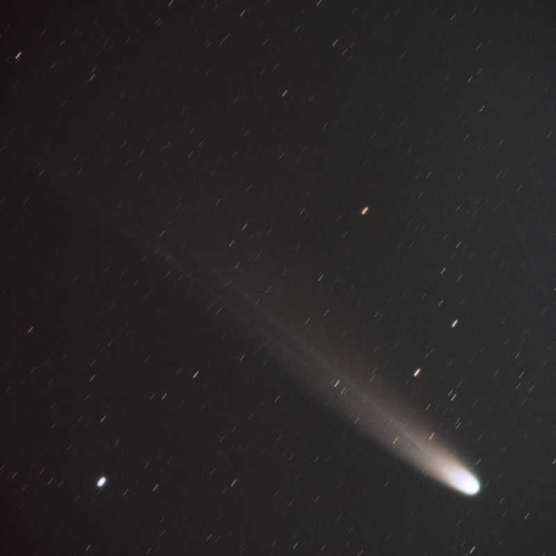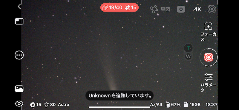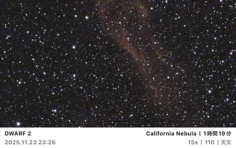 彗星の尾が、ほぼ垂直方向へ伸びてきた。DWARF IIは経緯台なので、水平垂直が地平に対してのそれになる。ただスタック合成だと、あまり長時間には向いていない。あと彗星の移動に対してもあっていないので、5分程度の露光にとどめている。彗星スタックモードでもあればなと思わないでもないが、ないものねだりはよろしくない。DWARF IIを購入した時は、まだ彗星データすらなかったのだから。