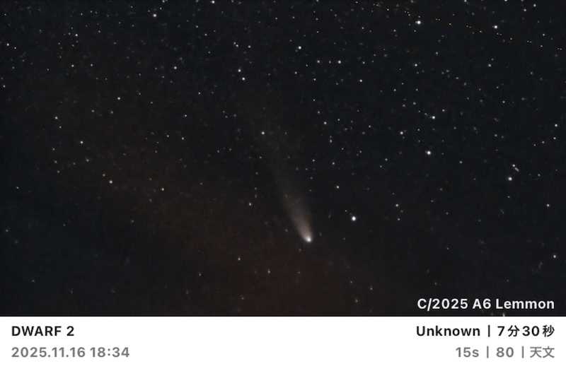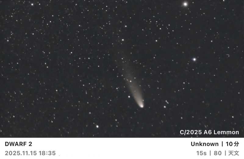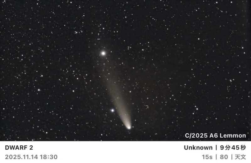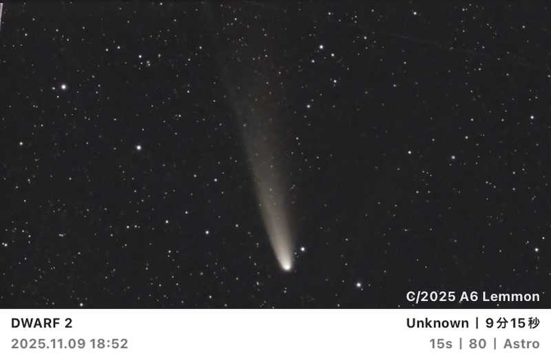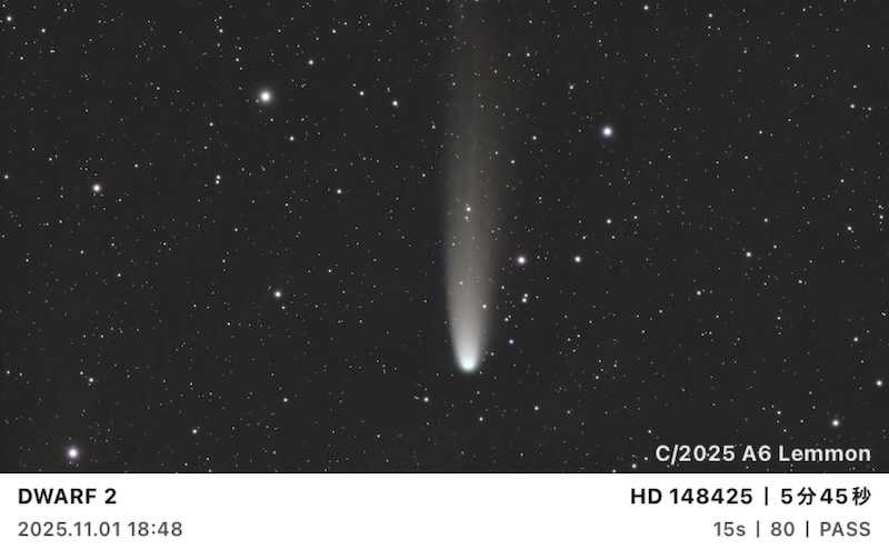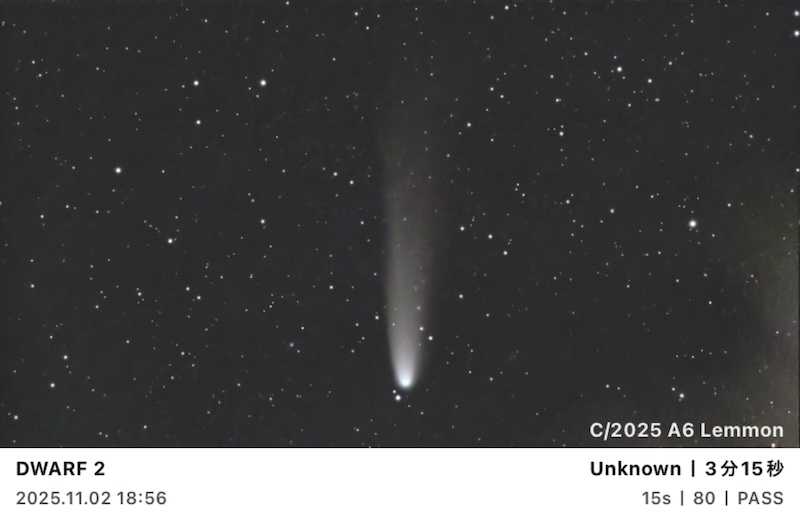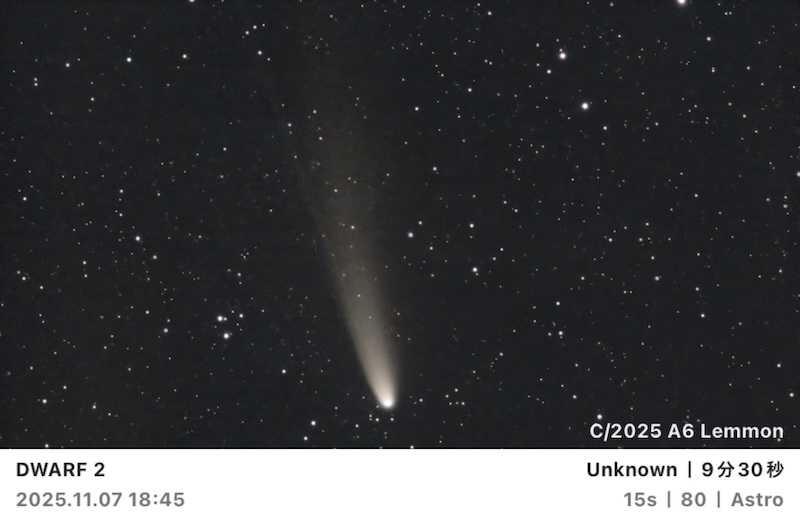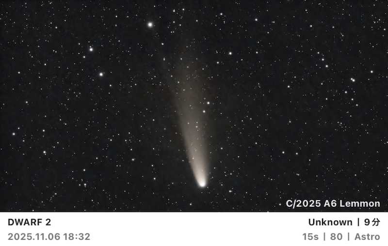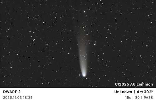 今日は結局、ダブルヘッダーは中止。眠かったのもあるが、空が白かった。PM2.5かなぁと思ったら、そうだった。もっとあると思うよ。さて、前回・・・11/11からC/2025A6レモン彗星撮影は、DWARF IIのみにした。だんだん終了が早くなってきてて、19時過ぎに終了だったのが既に19時前に終了となったから。冷却カメラで撮影するには・・・機材を組み上げて〜の冷却開始〜の極軸だし〜の明るい星でピント出し〜のガイドのキャリブレーションを出し〜の導入かけ〜の構図決め〜の露出決め〜ので、やっと撮影。私みたいなジプシーは、時間がかかるんだわ。常設機材の人なら楽なんだろうけどな。で、しかも11日や今日なんかは、2カット撮れたら御の字。DWARF IIですら、アライメントと導入と構図決めに露出。ドタバタしてると、20分程度しかない。結局DWARF IIのみの選択肢になる。そろそろこの彗星撮影の終わりが近い。