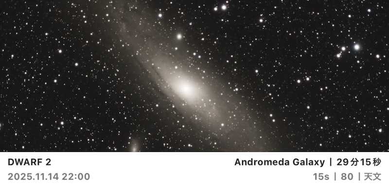 月明かりの中だったので、あまり写りがよろしくない。露出にも悩んだ。月夜に撮るもんじゃないかもしれない。2025/11/1 19:48-20:05 8s x75Kowa Prominar 500mm F5.6Kowa TX07-E 350mm F4 (F4.8)ZWO ASI533MC ProGAIN 450 -5℃IDAS LPS-P2QHY5L-IIM 75mmZWO AM5ST2.0sSI9.0p 彗星コリメート