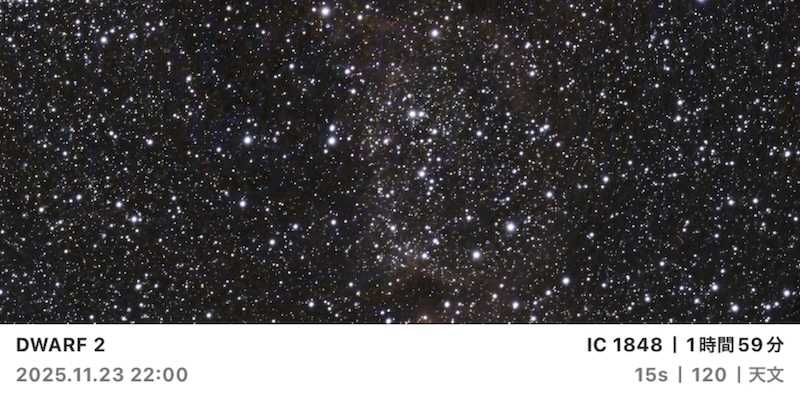 DWARF IIIはどうなったか知らないよ。持ってないから。写真スタジオ処理の為にアップロードさせるけど、エラーが出るのでナンジャラホイと思っていた。いろいろ調べてみると、アプリとファームウエアがアップデートされていた。それをやってもエラーが出る。星図のデータもダウンロードしたら、やっとアップロードされた。処理はあいかwラズ時間がかかる。充電したままほったらがし。アプリが表に使いづらくなった。これまでのダークは使えない。新しく撮り直し。それも自分で個別にGAINと撮影時間を設定して。GAINの上限が120まで下がる。これはまぁ許容範囲。たまーに130を使ったくらいだし、120でも問題ないかな。画面表示が変わる。これは慣れtら良いくらいかな。左下の絞りアイコンが露光時間とかちょっと微妙。左下の目のアイコンで、アイコン表示無しの全画面。でも復帰の方法が見当たらない。戻ってくれない。もう怖くて触れない。上の真ん中で、撮影枚数/設定枚数/スタック枚数表示はわかりやすい。あと一番困るのが、位置を変える度にキャリブレーション&ピント出しのやり直し。これは頂けない。構図上ちょこっと移動させたいのに、毎回大きく動かれちゃ時間の無駄。そしてたまにピントを外してくれたりする。追尾を外して、方向キーで微動させてすぐ追尾ができるなら良いのだけど。毎回やられちゃめんどくさい。これまでは、明るい星へのキャリブレーションしてから目標天体へ導入してた。そりゃ水平出しをしっかりしてなかったらずれるだろうけどさ。あと設定メニューの中が結構変わってシンプルになってた。いつも使う組み合わせは、クイック設定から選ぶとか。もうちょっと使い込まないとわかんない。ひとこと。結構微妙。