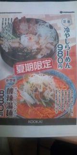 新メニューが始まりました 空海では久々の辛い系ラーメン皆さんもご存知の『サンラータンメン』ラー油、お酢などなど・・・といっぱいの野菜が乗っかり栄養満点のピリ辛ラーメン空海風にアレンジしてよりヘルシーに仕上がりましたよ更には夏の定番メニュー『冷やしラーメン』 どちらも初日から人気上昇してます 是非、ご賞味あれ
