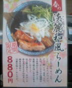 今日は朝から雨 府中街道が大渋滞でなけそうです私はなんせせっかちな性格なもんで...渋滞が大嫌いなんです私の雑談はこの辺にして...春の新作メニュー『淡麗和風ラーメン』は皆さん食べてみましたか?あっさりとした味の中に素材の味を存分に活かしており、旬の食材である青野菜は『水菜』をボイルもせず乗せてしまうのでシャキシャキでおいしいです是非是非