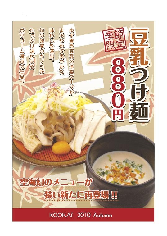 秋の季節メニュー『豆乳つけ麺』が今月末で終了となりますよ まだ、食べていただいていない方はお急ぎ下さい 中々の人気で今回も良好ですまた、12月より冬季限定季節メニューもご用意してます 楽しみしてくださいね