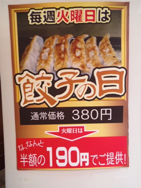 『餃子の日』開催 毎週火曜日は『餃子の日』で通常380円→→→半額の190円で販売中 前回の餃子フェアに続き出血大サービス 更にはお子様向けのメニュー登場 順調にご注文を頂いてますよ~