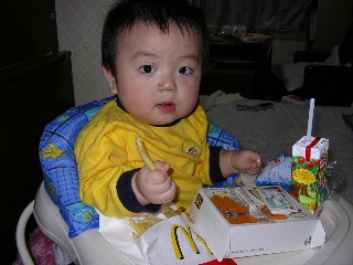 放置しまくりのこっぺです。最近は配達より営業をがんばらなくてはいけない感じなので転職したくなってきてます。。(笑)って、私の話はさて置き、息子の成長報告を。。いつまで話さかのぼらなくちゃいけないのか。。(;´Д`A ```とりあえずは伝い歩きが始まりました。10月30日頃から上の歯が生え始めました。しかも上の歯4本同時くらいに。。ばぁばが言うには今日から携帯を持って『もしもし』が出きるようになりました。多少、ばばバカも入ってますが私が見たとき一応できてたみたい。。バイバイはまだです。体重は・・10.7キロくらい。8月に10.5キロくらいだったのでここ最近はあまり変化なしです♪あとは・・自分で哺乳瓶を持ってミルクが飲めるようになりました。たまにそのまま眠ってしまって哺乳瓶を抱きかかえて眠ってます。って、うちのコ、出されたものは残しちゃだめって教えられてるのでしょうか。。ご飯もミルクも毎回ほとんど残すことなく全部召し上がってくれてます。。おかげでお腹もポンポコリンです。ハイハイはまだずりハイです。体が重すぎるのでしょうか・・(笑)今日はこんな感じで。うちの兄さんがマクド店員だからっていうことでハッピーセットは経験済みです(笑)