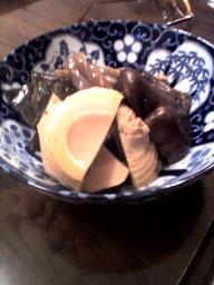 で、こんな感じで盛り付けてみましたが・・・まあまあじゃないかしら。もうちょっと煮込んだほうが「こんにゃく・椎茸は」良いかもね。