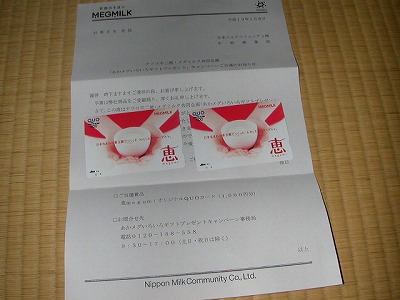 1月ももう24日になったんですね。先週水曜日が初荷でその後続いたのにまたパッタリと止まってしまったけど今週も水曜日に届きました。雪印&ナフコ不二屋 W賞クオカード1000円あの不二家じゃなくてお店だよ~なんだか良く似た事件が起きたけど、雪印のほうは立ち直ったおかげでこうやって懸賞もやってくれるからよかったわ。本賞はカタログギフトでしたが、昨年も別のスーパーでクオカードでした。1枚応募だったので嬉しいです。懸賞もでてきたけれど、近くのスーパーではレシート応募をやってないから買い物してもレシートが使えない。ロリエエフと小岩井のスーパータイアップが出てきましたね。小岩井を1枚作ってきたけど、昨日から始まっていたようでフライングじゃなくってよかった。早くアピタとかジャスコでもっとレシート応募できる懸賞がでてきてほしい。by:ちび子