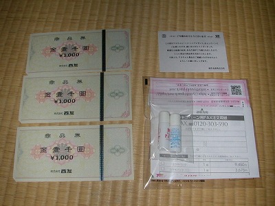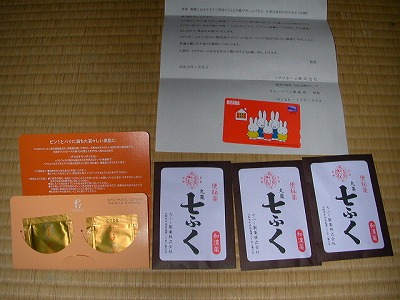 前に当確していた図書券500円が届きました。ゲームをしていただけるもので興味のある方はこちら。あとはサンプル2種類。七福はレンノンママちゃん情報でした。いつもどうもありがとう年賀はがきの抽選は切手3枚でした。数少ない私あてに届いたうち2枚当選していました。懸賞用に買った100枚から2枚であわせて5枚。早速引き換えてきました。昨年はふるさと小包が当たっていたみたい。今日はプログ開設1周年です。1月1日から始めようと思ってたのに、家族が休みだったのでなかなか出来ずこの日が記念日となりました。3日坊主の私が1年も続けることができたのは、訪問してくれるみなさんのおかげです。つまらない日記ですがこれからも宜しくお願いします。1周年プレゼント企画かいいキリ番の企画を開催する予定ですのでいつになるかわかりませんが、その時は応募してくださいね。by:ちび子
