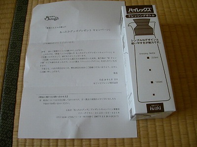 朝出かけて帰ってきたらヤマトさんの不在票が1枚。あて先は旦那の実家から。当選品かと期待してたからちょっとガッカリ。お昼を食べて電話しようとしたらヤマトさんが持ってきてくれました。実家の荷物のほかに小さい箱。キリンビバレッジ あったかグッズプレゼント W賞ドレッシングボトル本賞は昨日発送されていて、外れたけどW賞があること忘れてた。オリーブオイルにハーブ入れて使おうかな?簡単なレシピもあります。旦那の実家からはみかん。3箱目。みかんいらないって言ったのに忘れてる。だって旦那1個も食べないから減らない。そうそうみかんを使ったドレッシングレシピもありました。イチゴのほうがいいな~by:ちび子