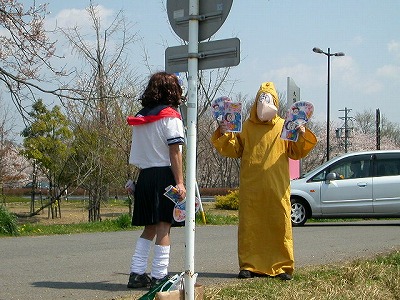 先週から鬼太郎がテレビで放送されている。HDDに撮っておいたら娘がはまったらしく昨日も予約してあった。昔に比べて鬼太郎がかっこいいし清潔。猫娘はスタイルがいいし女っぽい。全体的にきれいにスッキリしていて怖さが感じられない。昨日はねずみ男がゴミ箱からPCを拾うという現代的な話。絵は変わってるけど鬼太郎のおやじの声は昔のまんま。誰もマネできないよね。最初の歌は歌詞はそのままだけどちょっとロック調で歌ってるのは泉谷しげる。最後の歌は歌詞も声もインパクトがあって、誰が歌ってるのかと思ったら長井秀和だった。わかって聞くとそうだ、あのねちっこい声は。そして昨日こんな人発見ある会社のイベントで丁度信号待ちで止まったのでパチリ。反対車線には鬼太郎もいたのだった。志村けんのへんなおじさんとか他にもいろいろ。セーラー服の人はもちろん男で化粧してた。by:ちび子