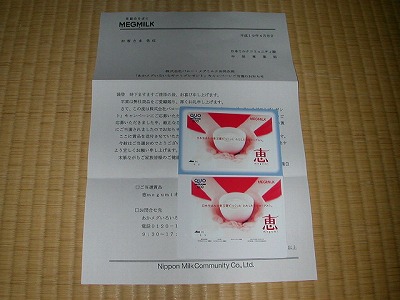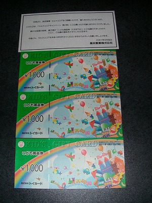 今日はお届け物はないと思っていたのに夕方郵便屋さんが書留を持ってきてくれました。森永ココアこども商品券3000円久々の全国版当選。実はお昼に実家から電話があってアジエンスのW賞森永ココアからの不在票があったと連絡してきた。多分うちと同じ3000円のこども商品券。全部で2枚応募して両方当選できた。うちは外れたんだとあきらめていたのでよかった。これは回収できるよ。アピタやジャスコ、平和堂、ダイエーなどで子供服も買える。アジエンスは先月の当選に記録しておこう。今日はジャスコで3000円買うとスクラッチができて2枚引いたけどはずれ~9時から開催で12時前に引いたときにはアタリがもう1枚だった。賞品はドラゴンズとカープのチケットだったのに~残念。今日は懸賞はお休みで明日からまたはがき書こうっと。日本400メートルメドレーで金取って欲しい。by:ちび子