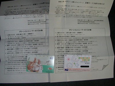 最近懸賞もブログも家事もサボリ気味です。スーパーちょっと巡ってきて帰ったら封筒が2枚ありました。東海三県グリーン購入キャンペーンで図書カード 500円図書カード 1000円オープンのは500円?ユーストアかアピタのW賞は1000円?最初に1000円の開けたものだから1000円2枚だと思ってもう1枚開けたら500円でちょっとガッカリ。反対なら嬉しいのに。あとは今週とどいたサンプル2つ。化粧品はエイボンかな。実家から留守電が入っていてユーストア&UCC・森永商品券2000円が佐川便で届いたようです。うちにはこない。朝は近場のスーパー周ってきました。ユーストアで2枚、ナフコで1枚。偶然にも今日当選したスーパー、ナフコではUCCのレシート作ってきたしちょっとビックリ。先ほどお花を買ってきました。18ポットで2000円しなかった。夕方から草とりして植えられるかな?昨日は不在票があって届いたらアップするつもりだったのに配達記録はカード更新でした。小さく小包アリって書いてあったのでそれも持ってきてもらうように言ったのになかった。配達記録の封筒にも小包アリって書いてあるのに物がないなんて。配達の人と再配達の人が違うからどこに行ったんだろ?うち宛の小包。今日も持って来てない。by:ちび子