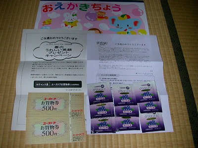 DSライトはハズレだわ。本日の当選品は郵便でユーストア&サントリー W賞 商品券1000円昨日メール便で届いていたネット応募W賞クリッシュ ブルーベリー味3日分母の日の絵を出してきたらお絵かき帳をいただきました。ユーストアのはサントリーの詰め合わせに1枚応募したはがきのW賞だったようで、難関のユーストアで本賞とW賞は当選しないよね。実家に何か届いてないかしら・・・クリッシュは3個づつ9袋あります。今月W賞の多いこと。Wでも商品券はありがたいわ。早速来週にでも使ってこよう~夕食はこの前当選したジンギスカンをいただきま~す。全然似てないよ~by:ちび子