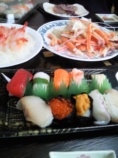 スーパーでカニ、お刺身、甘エビ、お寿司など買ってお昼に食べました。