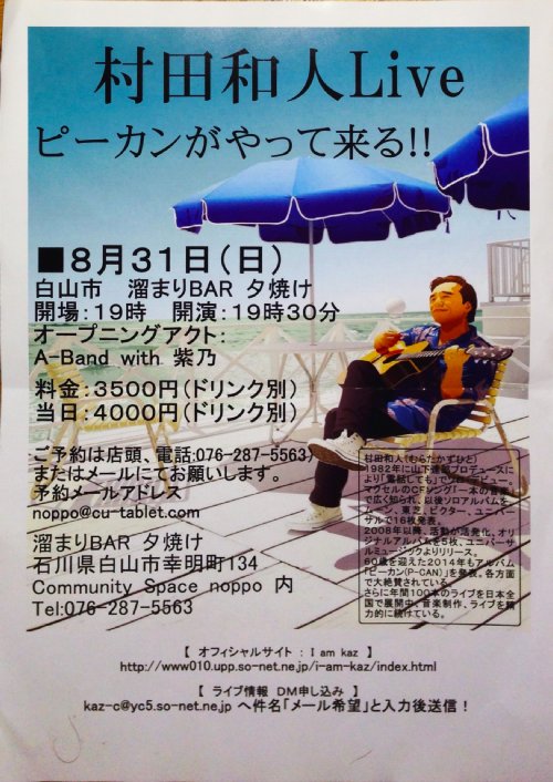6月も終わり。一年の半分が過ぎていった。なんとなく焦ってしまうのはなぜだろう。そんな今日(6/30)は、松任駅前ライブサーキット観戦。あいにくの雨で、室内での開催となったが、大盛況だった。出演は、フォークのカバーの「TAZU」、アコースティックオリジナルの「今日休みます、腹痛につき」、ジャズなのか!?の「いのちゃんず」。いろんなジャンルがあり、楽しめた。TAZU懐かしくて、くすぐったい選曲。今日休みます、腹痛につき実はお初。印象的な、いい曲が多かった。いのちゃんずあれだけのバンドメンバーを集めて、バカバカしい歌詞とMCで、俺は釘付け。たのしいライブだった。超久し振りの人にも会えて、とっても満足な夜だったのだ。さて、明日は夕焼け8周年第1弾の今剛&HUのライブ観戦。明後日は夕焼け8周年第2弾のEmi Tem Happy DrawbarのライブにA-Band with 紫乃で出演。楽しい週末がやってきた!