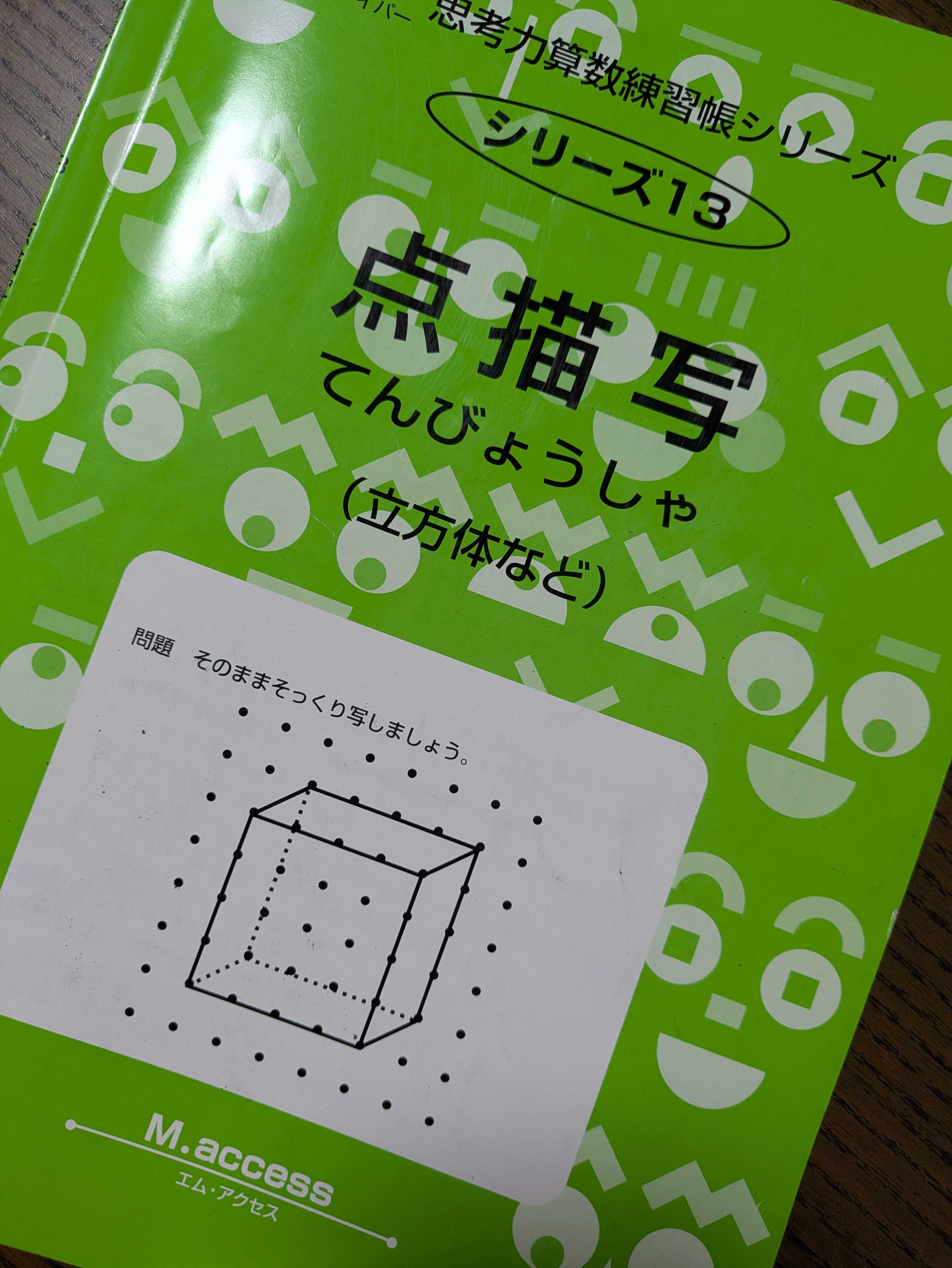1年以上かかったかも?まさに↑この表紙のを色んなパターンでひたすらやるだけです(笑)点描写 1 新装版 (サイパー思考力算数練習帳シリーズ 13) [ 石川久雄 ]↑新装版になった様子立体図形が得意になるといいな考える力を育てる 天才ドリル 立体図形が得意になる点描写【小学校全学年用 算数】 [ 認知工学 ]先日某中学の説明会でも空間把握が必要な問題は必ず出しますと言っていました!特に小さい子はうつすだけだから難しくないしいいトレーニングかなあと感じましたよ(^^)
