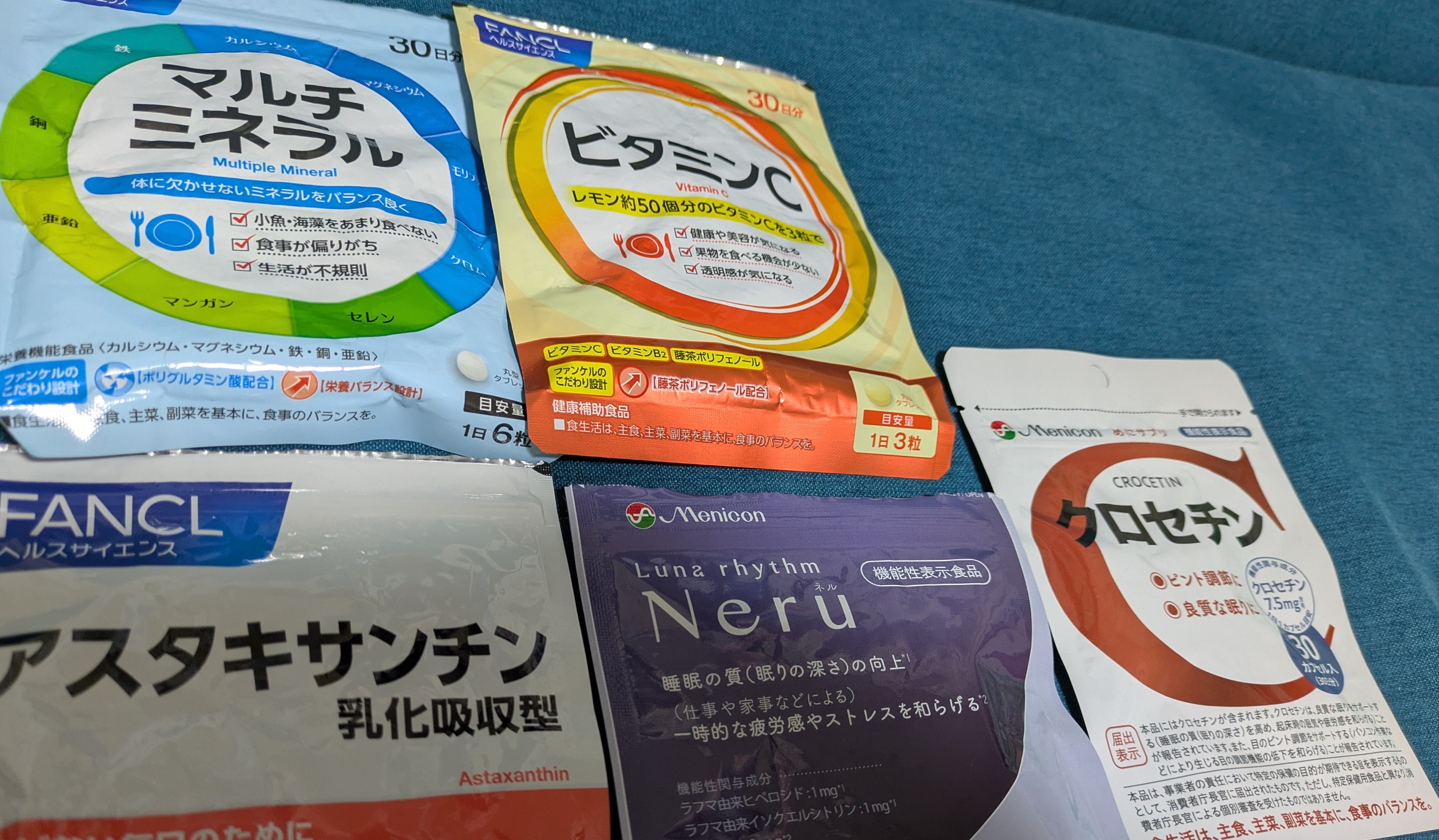 たんなる記録なんですけど(笑)ビタミンCは美白用です!朝昼晩3回飲んでいますお手頃価格のFANCLさんファンケル ビタミンC(90粒入*3袋セット)【ファンケル】[ビタミンC ポリフェノール]↑クーポン出てたら楽天24が安い!マルチミネラル<栄養機能食品>【ファンケル 公式】 [ FANCL サプリ サプリメント ミネラル 健康 お徳用 鉄 カルシウム 亜鉛 マグネシウム 男性 女性 カルシュウム 鉄分 栄養補助 美容 ミネラルサプリ ミネラル不足 栄養 ヘこれは朝晩飲んでいます貧血予防ですね鉄分はビタミンCと一緒に取ると吸収されやすいそうファンケル アスタキサンチン 乳化吸収型(30粒入*3袋セット)【ファンケル】↑アスタキサンチンは抗酸化作用が高いらしく飲む日焼け止めにもなるとかということで朝に飲んでいます脂肪分と一緒に取ると良いらしいですよアスタキサンチンと亜鉛(↑のマルチミネラルに入っている)を一緒に摂るとよく眠れるそうです体の中のタイムスケジュールがうまく働くだったかなということで【メール便可能(3点まで)】ルナリズム Neru ネル 30日分 60粒入 【メニコン コンタクトレンズメーカー 機能性表示食品 睡眠の質 ラフマ葉 ストレス 疲労感 リラックス GABA ギャバ サプリメント 健康食品】こちら!これ効く気がします【店内P最大57倍以上開催】【DHC直販】クロセチン+カシス 30日分 | dhc サプリメント サプリ 1ヶ月 ルテイン ブルーベリー DHA EPA コエンザイム ビタミンe【栄養機能食品(β-カロテン)】DHC 目のサプリ 目 眼精疲労 目の疲れ 栄養機能食品 健康サプリ 眼クロセチンは目の疲れにも効くし睡眠にも効くそう✨最近調子良いです!ので今後も続けます!日焼け止め効果はわからないけどね(笑)アスタリフト サプリメント ホワイトシールド 約30日分 60粒 [機能性表示食品]【FUJIFILM 公式】| サプリ アスタキサンチン 紫外線 紫外線対策 UVケア ケア uv リコピン コラーゲン ビタミンC ビタミンE 飲む 肌 乾燥 富士フイルム ASTALIFTシミ対策にユベラも加えたいなあと思っています😊【第3類医薬品】ユベラCソフト 192包高いけどこれも欲しい【第1類医薬品】トランシーノEX(120錠)【トランシーノ】[肝斑改善薬 L-システイン トラネキサム酸 30日分]今ピコトーニング通っているので今度通院の時薬はいくらか聞いてみようかな