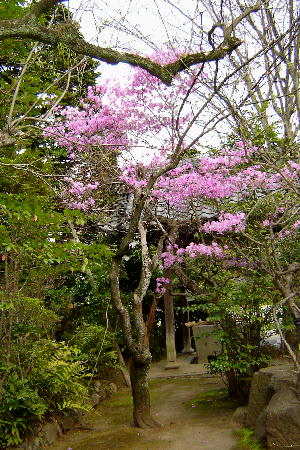 花見をした公園からの帰り道椿が何種類もある通称…椿寺の庭を歩く。庭の木々を眺めていたら紅紫色?ピンク?の花をつけた木に目がとまりました。あっ?ミツバツツジの花かも…自分の目を疑いながらその木に近づきました。葉の出る前に美しい紅紫色の花を咲かすミツバツツジ…桜を存分に眺めてきた後にまた素敵な花が見られるなんて…「ラッキー!」でした。庭の裏には、ひっそりとシャガの花も咲いています。湿っぽい日陰で見る花で近づいて花をよく見ると形の複雑さに加え、神秘性と色の繊細さに目を奪われます。花見の帰りに再び花を楽しませて頂きました。