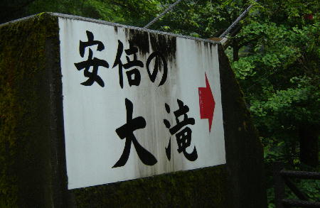 今回、私が静岡を訪れたのは観光目的ではなく、他の事を考えるために訪れた筈だった…のですが…静岡駅から車で30分くらいの土地に先日行った「不動の滝」を眺めてから滝の魅力に引き寄せられ、時ならぬ?滝巡りをすることになりました。<安倍の大滝>安倍川水系には滝が多く、前回載せた「三段の滝」や「不動の滝」の他に「鯉ヶ滝」「湯滝」「赤水の滝」などがあって時間さえ許せば滝巡りをすることも出来る。梅ヶ島温泉手前に「安倍の大滝入り口」のバス停があるが、私は梅ヶ島温泉から雄大な山々を眺めながら、そのバス停まで歩いた。案内の看板があるので迷うことはない。片道、約40分程度のコースなのだが…あいにくの雨降りで、傘を片手のハイキング?果たして40分でたどり着けるのだろうか。案内文字の横にこの様な長い吊り橋が架かっていました。この様な頑丈な吊り橋だったら子供でも大丈夫!結構長い…(走っちゃおーかなー☆テンションあがりまくりで、傘を片手に鼻歌交じり♪…でした。そう…この場所までは…(^^;)吊り橋を渡りきったところで沢に降り、たった今渡った吊り橋を下から眺めました。その風景が下の画像です。白く見えるのが吊り橋です。この沢で持参したおにぎりを食べました(^^)/安倍の大滝に辿り着くまでにはあと二つの吊り橋を渡らなければなりません。一人ずつ静かにお渡り下さい…ですか(^^;)何となく怖い感じがして、足が前に出ません。。。(スリル満点のようですね~傘さしてこんな吊り橋を渡れるわけないじゃん…(汗)オマケに板はボロボロみたいだしィ~~(涙)手すりだってワイヤーが一本だけじゃんかよ。。。雨降ってるしぃ~一人だしぃ~~。板濡れてるしぃ~~~高いしぃ(半べそです)足を滑らして落ちて死んでもきっと誰にも気付いてもらえないだろーなぁ~~。。。「軽はずみな奴…」と笑い者になるかも…う~ぅぅぅ…前に進むべきか、引き返すべきか…自分の中でかなり葛藤しましたが、結局…意気地なしの私は前に進むことを諦めました(>_