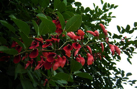 夏になると名の知らい赤い花が気になります。地元の公園や海岸沿いでよく見かけます。以前、花屋さんに名前を尋ねたのですが、私の説明が悪いのか、勘違いされたのか花屋さんの教えてくれたのは、「カナメモチ」という木でした。二年くらい前からこの花を見るたびに、名前が知りたくなります。我が家にある植物図鑑は安物なので、この種類の花の名前は出ていませんでした。ところが今日、偶然、役所が管理している公園でこの花を見たのです。名前の札がないか近くに寄ってみました。ありました!その木?花の名前は…「アメリカデイゴ」でした。<アメリカデイゴ>…南米原産私を悩ませていた花…アメリカデイゴの画像です「デイゴ」と知って、えっ、なんか変じゃない?そうなんです…私の頭の中は沖縄の島唄に出てくる「でいご」の花を想像していたのです。「アメリカデイゴ」と「でいご」は、別種ということを知ってヤレヤレ…沖縄の「でいご」は、デイゴエリスリナという高木落葉樹で、日本では沖縄が北限とされる木だった。こちらの画像が沖縄県の県花「でいご」です。デイゴエリスリナ…インドやマレー半島原産でいご~~~の~~~はなーー♪島唄をつい口ずさむまんまんでーでした。