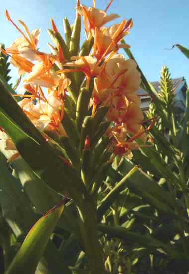 我が地元の東三河…恵みの雨を期待していたが、期待はずれで…雨が全く降りません。神様は不公平なことをなさる。丘の公園に向かう畑で、生姜の花を見つけました。生姜の花…インド原産 ●花ことば{豊かな心」「何の花だろう?」と葉っぱを見ると 生姜の葉に似ている。しかし…こんなに大きく育つのかなぁ…花までの高さが 2m以上はありました。自宅に戻り、早速調べてみる。晩夏から秋にかけて 背の高い大きな花を咲かせる。色は白、オレンジ色など。白がベーシックな生姜で、 そこからオレンジや黄色のなどの背の高い 花ものが改良して作られた。なるほど! この花だったんだ(納得植物学的にはショウガ目、ショウガ科、ショウガ属…舌を噛みそうです同じショウガ目には ミョウガやウコンも含まれる…と ありました(スッキリです