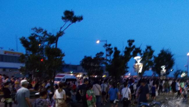 夕方、6時30分頃、花火大会の会場に向かいました。自宅から会場までは 歩いて15分くらい…散歩で時々出掛ける港で見学しました。会場に向かう道は 人、人、人…午後7時頃…花火が上がり始めました。下手な画像ですが、暫くお付き合い願います。大輪の花火が撮りたかったのですが、シャッターチャンスに恵まれず、このようなのしか撮れませんでした。(;一_一)ヒュル、ヒュル、ヒュル~~~~どっか~ん!!8時を少し回った頃、一発目の正三尺玉が上がりました。この瞬間、観客が一斉に歓声をあげて拍手をします。迫力ある大きさに興奮します。手が届きそうなくらいの所まで 花火が降り注いできます。その後、花火は9時まで打ち上げられましたが、クライマックスの仕掛け花火の時にも三尺玉が上がりますが、私は帰り道の混雑を避けるため、途中で帰宅しました。やっぱり、花火は良いですね。また来年です。