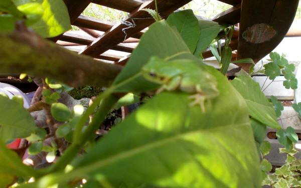 ベランダで洗濯物を干していたら、何かが動いた…何?…ん、んんん…カエルか?カメラ、カメラ…逃げられないうちに写しとこ。洗濯物、そっちのけで 暫くカエルを眺める…自宅の周りには、田んぼも 畑も 池も、川もない。一体、このカエルは何処から、どうやって我が家のベランダに来たのでしょう…手を出すと、のろのろと移動した。そして日蔭に隠れる…カエルも暑いのは苦手なんだ…ところでカエルくん、君はアマガエルなのか、アオガエルなのか どちらですか?私の問いかけが 聞こえているのか、いないのか…カエルは、目を細くして眠たそうにしていた。