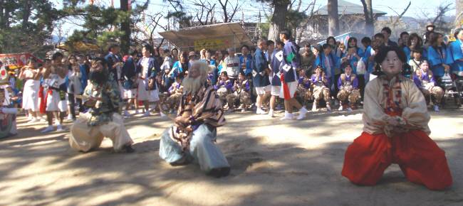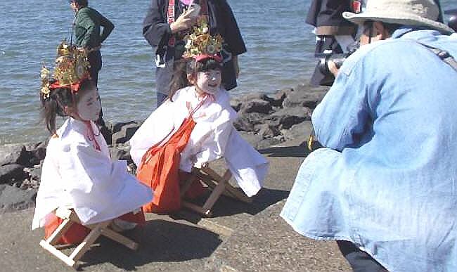 神子(みこ)姿に扮した二人のお子さん。カメラマンの要望に応えてニッコリ…その愛らしさに数人のカメラマンがシャッターを押していました。山車の安全を願うような神子の姿。絵になりますね。山車の海中渡御の間、笛を吹いていました。奉納踊りの前のひととき…二の鳥居の注連縄をとく儀式に向かう人々の姿。この縄をとくと奉納踊りが始まります。道具(刀?)を手にした氏子大名行列に参加する子ら。毛槍を持って会話してる姿が いかにも現代っ子らしかった。奉納の舞に向かう天狗恵比寿と白狐の面を手にして…くぐり太鼓の踊り手も急ぎます。頭巾を下ろしてても前が見えるのかな?くぐり太鼓と言っているのは 親が二人の子の間を潜るような所作で 踊る場面があることによる。次回は奉納舞のひとコマを…