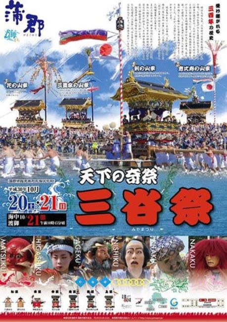 今年も待ちわびていた三谷祭りが20日(土)21日(日)に開催される…蒲郡市三谷町は 私が17歳まで育った町。この三谷祭りは、祭りの中でも 私が 一番愛してやまないお祭りなのです。親、兄妹たちと過ごした 祭りの想い出だからでしょうか…三谷祭りと云えば…山車の海中渡御がメインですが、今回は、祭りのもう一つの見どころ、奉納踊りを簡単に紹介しようと思います。ポスターの下に歌舞伎役者のような画像が載っていますね。三谷町は地区が6区に分かれています。その六区が それぞれの舞を神様に奉納するので、山車と共に、奉納の舞(練りといいます)の一部をご紹介致します。劔の山車…上区上区 練り…スサノウの舞、その他。恵比寿の山車…西区西区 練り…大名行列(奴)その他。三蓋傘の山車…北区北区 練り…七福神踊り、その他。花山車…中区中区 練り…連獅子、その他御神輿…松区松区 練り…くぐり太鼓、その他。神船若宮丸…東区東区 練り…子踊り、その他。天狗の持つ棒で頭を撫でてもらうと御利益があるとかで、舞が終わると見学者の皆さん 自ら頭を天狗様に突き出したりします。そのほかにも「くろごま」と呼ばれるものなど地域ならではの催しが沢山あります。奉納の舞にも、それなりの意味があり、歴史があり…お祭りって、奥深いですね。お付き合い、有難うございました<(_ _)>※掲載の画像はyahooの共有画像から拝借していますが、拝借した画像に、若干、手を加えたものもありますので ご了承願います。