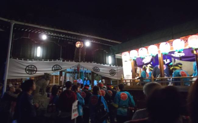 午後6時過ぎ、再び大宮神社に向かった。神社は、先ほどと違って混雑している…子供たちが演奏する祭り囃子が、各地区ごとに奉納され、全ての地区の奉納が終わると いよいよ手筒花火の奉納が始まります。山車の上で祭り囃子を奉納する子供たち(右の方)奉納が済んだ山車が並びます。各地区の山車に派手な装飾はなく簡素な造りでした。午後7時過ぎ、最初の花火が上がります。簡単な説明をつけて画像をUPしましたので楽しんでいただけたら、嬉しく思います。大筒花火1基…大筒はやぐらで上げます。手筒花火…1人火が付きました、いよいよ抱えます。踏ん張って熱さに耐えます。大筒花火二基片手持ち手筒花火…普通の手筒花火より小さく 片手で持っています。花火は小さいけど 以外にキツイのでは…と思いました。手筒花火2人…火がつけられました。抱えあげますわっしょい!!見事に抱えています。最後の場面。手筒花火は、火の粉が上にあがって、終わった後に大きな音とともに底が抜けます。底が抜けるときが、もっとも危険な時、持ち手は細心の注意を心がけます。このような手筒が8時30分頃まで続きます。持ち手も次第に人数が増えて、5人が同時に手筒を持って上げる場面は圧巻なのですが…夜の風は冷たく、小雨もパラパラ…私はここまで見て 帰宅することにしました。