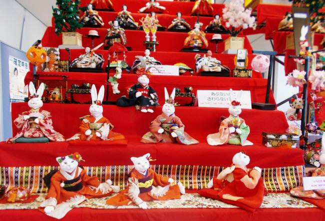 先日、岡崎に行った帰り、地元の駅の構内にある 観光ナビテラスにお雛様が 飾られていたので入ってみた。普通に見る五段飾りのお雛様でしたが、その下の六段目にはウサギのお雛様。七段目にはネコのお雛様が飾られていた。手作りであろうと思われる ウサギとネコのお雛様…その愛らしさに つい見とれてしまった。このような人形、大好きです(^^♪ネコ好きにはたまらない! 可愛いなぁ==♡ムム、ム…こちらの黒猫ちゃんは…ちと怖い。何か気に入らないことでもあったのかな?雛まつりでよく見かける吊り雛もありました。ちりめんの生地を手縫いで一針、一針 チクチク…チクチク…根気のいる作業です。作った人の気持ちが込められていますね。私も一度 挑戦したことがありますが、この ちりめんの生地って以外と 高価で 縫いにくい生地です。結局、それっきり…となりました(~_~;)