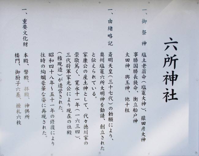 JR岡崎駅前からバスに乗り 東岡崎まで…目的の六所神社は 東岡崎(名古屋鉄道本線の駅)から徒歩で3分ほど。六所神社の説明看板です。駅前の大通り沿いに赤い鳥居がありました。ここから参道になるのですが、途中に踏み切りがあり、ちょうど、名古屋鉄道の快速電車が通過していました。写真を写していたら 普通電車の赤い車両も通過しました。珍しい風景だったので もう一度、パチリです。鳥居の左側にはこのような石柱。右側です(懸社六所神社)とありました。少し奥に建っていた石柱踏切を渡ると両脇に松並木の参道。近辺は住宅街です。参道の燈篭鳥居手水舎神馬左側に石垣が続いていました。神社は この石垣の上に建っているのでしょう…階段の上に見えるのが楼門。とても急な階段です。別の方から参拝できる道がありました。そそっかしい私は、それに気づかず、階段を上りました(~_~;)五万石以上の大名だけが 上がることを許されていたと伝えられます。階段をあがると 極彩色の楼門。その奥に社殿が現れます。拝殿左側に回ってみました。右側です。右側の続きです。装飾の一部。松平家の産土神として、松平家、徳川家の崇敬が厚く現在も「安産の神様」として信仰されている神社です。昭和51年に 日光東照宮と同じ手法によって 修復工事が行われ、建立当時の美しさを再現。また、本殿、幣殿 拝殿、楼門、神供所は 国の重要文化財に指定されています。楼門の内側にあった獅子頭(硝子に建物が反射してしまいました)神供所三晃大黒社祀られていた大黒様(良いお顔をされておりますね)お疲れさまでした。<(_ _)>