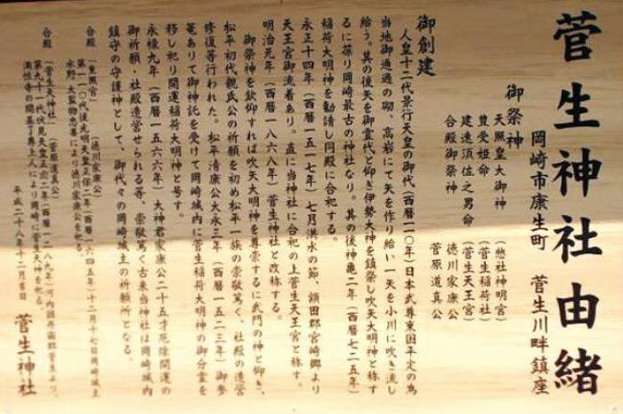 菅生(すごう)神社…岡崎市康生町社伝によれば、起源は第12代 景行天皇の時代にさかのぼる。西暦110年 景行天皇の子 日本武尊が東国平定のために菅生に地を通過した際、高石(今の菅生川畔あたり)にて矢を作り神風にて一矢を吹き流し、その矢を以って伊勢大神を勧請し神社を建てた。御祭神…天照皇大神、豊受姫命、須佐之男命、 徳川家康公、菅原道真公をお祀りしています。徳川家康が25歳の時 厄除け、開運祈願をされ、江戸幕末まで、岡崎城主代々の祈願所とされた。城主より社殿、鳥居などの寄進を受け 岡崎城内鎮守の守護神とされていました。石柱鳥居どこかを修復するのでしょうか…境内には車が数台駐車され、職人さんらしき人物が、何かを指差して話し合っていました。社殿社殿内稲荷大明神