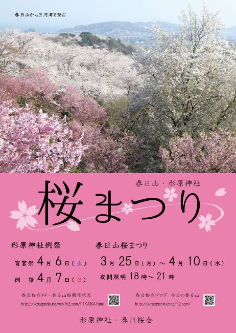 形原町…と言えば「あじさい」で知られますが、なんの、なんの、桜も楽しむことが出来るのです。今回、私は形原神社(春日大社)を参拝した後で、早咲きの桜を楽しんできました。(形原神社の参拝の様子は後日UPします)春日山桜まつりのポスター今回、私は山頂桜ゾーンに行きました。形原神社の横にある案内板少し登ると三河湾が見えてきました。山の中腹にあった山頂案内看板案内看板に従って登っていきます。眺望も楽しみの一つですね。だいぶ上まで登ってきました。頂上が見えました。さて、どんな風景が見られるのかな…広々とした空間に 桜の花が咲き誇っています。山頂から三河湾を望む。満足、満足…今回も歩いたなぁ…ソメイヨシノが満開になったら、もう一度訪れるつもりです。