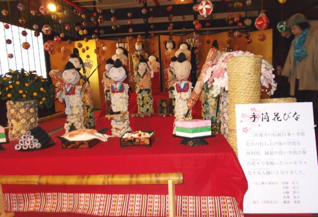 先日、テレビの情報番組で 二川宿本陣資料館で雛人形が展示され、御殿飾りを紹介していた。それから数日間、その御殿飾りが 気になって仕方がなかった。3月10日まで開催しているとの事。今日、気になる 御殿飾りを見に行ってきた。入館料400円を支払い館内へまずは、豊橋らしく手筒花火の筒を利用して作られた手筒花雛が 迎えてくれた。吊り雛も多数…似たような画像がつづきます。御殿飾り吊り雛…圧巻です。御殿飾り屏風飾り、御殿飾り御殿飾り御殿飾り…昭和期御殿飾り…これだけ並んでいると 豪華過ぎて 目が眩みそうです。御殿飾り…昭和10年御殿飾り…大正期歌舞伎ケース飾り…昭和初期内裏雛…明治40年頃天神…昭和46年屏風飾り…昭和17年御殿飾り…大正5年 説明文をメモするのを忘れましたので 材質が何か分かりませんでした。内裏雛…大正期土雛(土人形)掃除道具を手にした雛これでもか!って言うくらい飾られていました。豪華絢爛、満足、満足…雛祭りのパンフ、この後、資料館を見学し、二川伏見稲荷、大岩神明宮に参拝してきました。商家「駒屋」が資料館の350m先にありますが、寄りませんでした。お疲れさまでした。