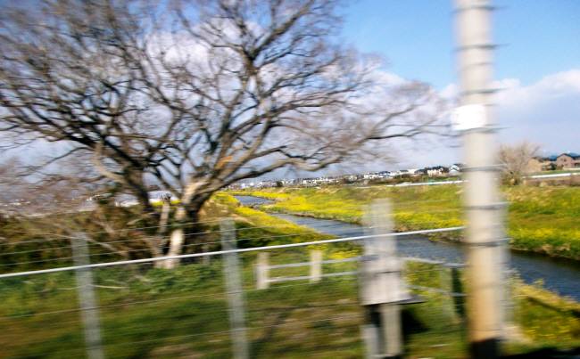 去年の春、豊橋行きの電車に乗った時いつものように私は 窓の外をボーっと眺めていた。そんな時に突然、目に飛び込んできた風景が記憶に残り、以来、上り電車に乗るたびに その風景を眺めるようになりました。春以外の季節は なんの変哲もない ただの小川…だが、春になると その小川の両端が黄色い花で埋め尽くされ、一枚の絵を見ているような 美しい風景と変貌するのです。先日、電車がその小川付近に近付いた時、私は バックから小型カメラを取り出して シャッターを押した。その時の風景画像です。走る電車の車窓から…ガラス越しなので、画像がハッキリしませんがこの風景が 車窓から眺める 私のお気に入りです。黄色い花は、菜の花やタンポポかと思います。もう少し日が経てば、この黄色がもっと広がって鮮やかな黄色になるのです。一度でいいから、この川の土手に座って「ぼ~」っとしたいなぁ…と思う 今日この頃です。