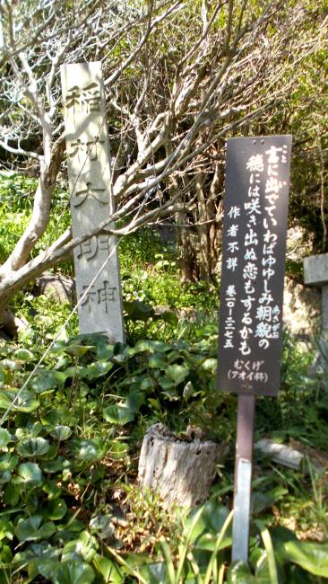 前回の「万葉の小径」の続きです。朝日の輝く丘を後にして 稲村神社に向かいました。稲村大明神の石柱と 植物を題材にした歌。一の鳥居、急勾配の石段が待ち受けています。二の鳥居 階段から直ぐの場所にあり、踊り場が狭く危険なため、斜めから…二の鳥居から下を見る…木洩れ日で見にくいですね。ここから、境内までもう少し石段を上ります。山の頂上にある 境内に着きました。階段の数を数えながら上ったら106段ありました。家にあれば 笥に盛る飯を 草まくら 旅にしあれば 椎の葉に盛る……有間皇子御神木のシイの巨木(蒲郡、名木50選の一本)手水舎拝殿由緒書き…社格社号は無格社と書かれています。写真が下手で、読めませんね。スミマセン<(_ _)>御神木と桜…手水舎が小さく見えます。階段の途中にあるシャシャンボの木。シャシャンボとしては極めて大きい。神社の急な石段は 下りる方が怖かったです。一段一段、ゆっくりと注意しながら下りました。帰路は桜の花びらが舞う坂道を下ります。この日、背広を着た男性が一人 途中の休憩所で 弁当を広げていましたが、この後、誰にも出会うことなく、貸し切り状態…のんびり散策が出来ました。
