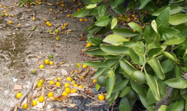 摘果されたミカンの実がゴロゴロしているミカン畑