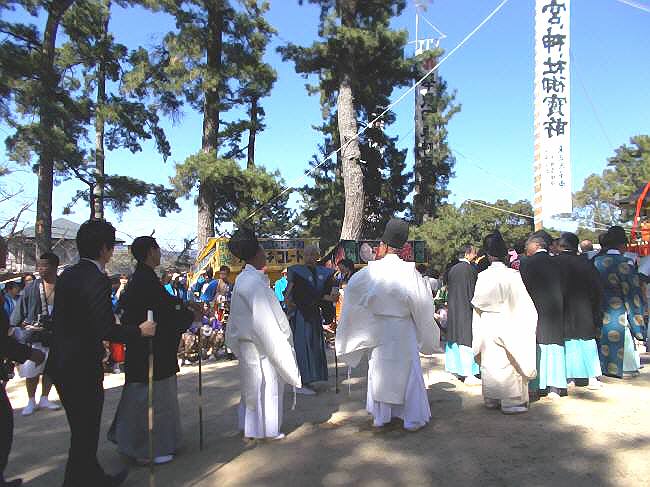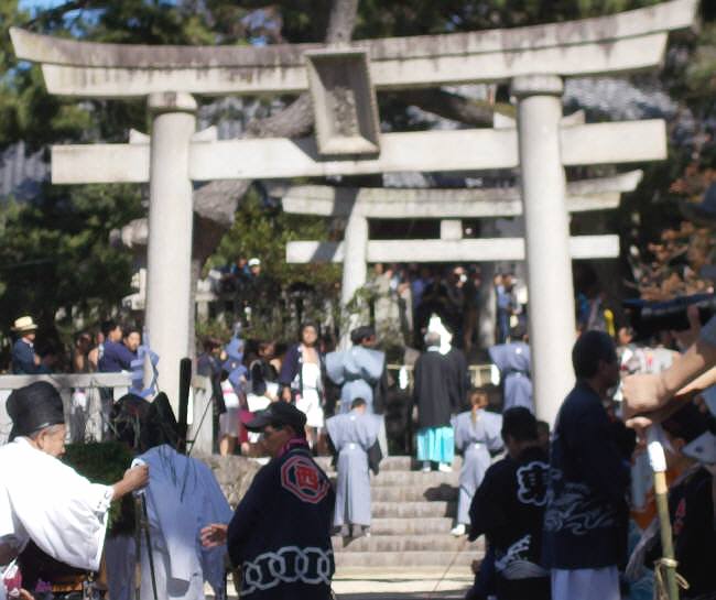 ​​二の鳥居の注連縄をとく儀式に向かう人々の姿。