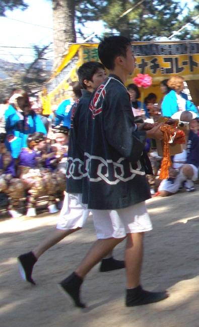 山車の海中渡御の間、笛を吹いていました。