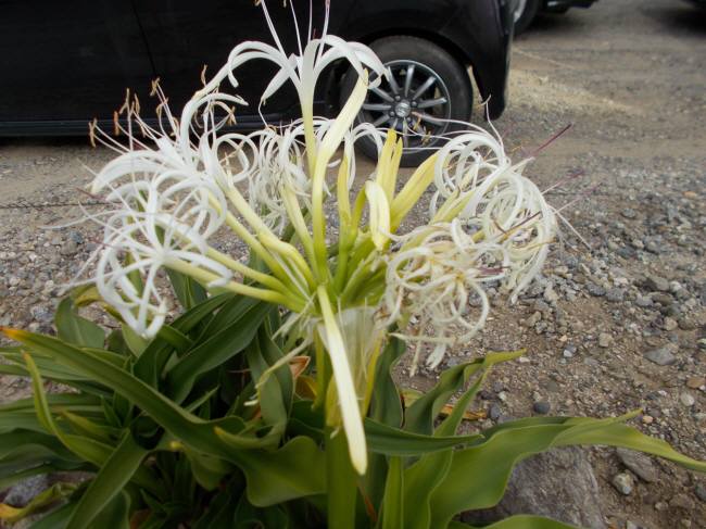 夏によく見るハマユウの花が 駐車場の空き地で咲いていた。