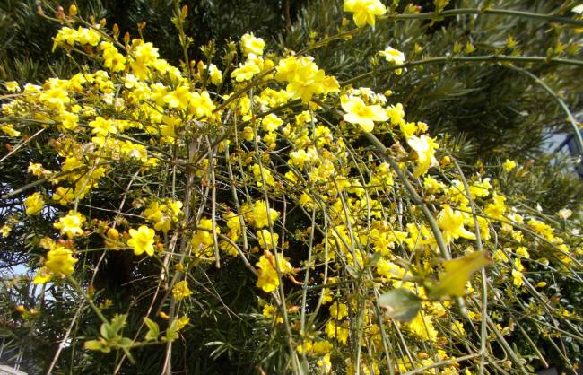 垣根から外を眺めるように 伸びた枝には黄色の花…