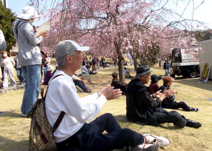 ​​皆さん芝生に座って民謡を楽しんでいます。