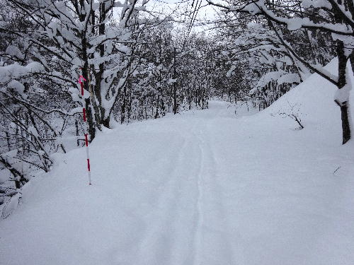 今回の山行は,伊納山。前日,山岳会の総会があり,山への情熱が再燃した直後の山行です。数年前に時間切れで退却した山のリベンジで,コースを変えての挑戦なのです。登山口の春日は,自宅から比較的近くて20分もかからずに到着しました。準備をしていると,マイクロバスが到着。高齢者の集団で,聞くとスノーシューで伊納山をめざすのだとか。冬山では人がいると心強いんですよね。しかし,この集団とは最後まで会うことはありませんでしたが。。始めは沢沿いの林道をてくてく歩きます。今回は,新調した山スキーの金具の試し履き。また,昨日自宅で見つけた兼用靴のツアー用のタンを見つけてすねが痛くならないのか試してみます。始めはこんな看板を見つけてほのぼのしてました。沢沿いの道は,しばらく続きます。雪はすねの上辺りかな。シカらしき足跡が続いていて,若干助かります。やがて分岐が続いて,高速道路の下に出ます。ここからいよいよ道なき道を登っていくのです。ところが,取り付こうとした尾根の手前に川が流れているではありませんか。これは地図でもわかりませんでした。仕方なく,渡れるところを探します。すると,シカが歩いた跡を発! スノーブリッジを教えてくれました。こうして,無事尾根に取り付き,あとはひたすら高度を稼いでいきます。やがて,高速道路を上から見下ろすようになってきました。スキーの方も好調で,がたつきのない金具は頼りになります。また,歩行用の柔らかいタンのおかげで,すねも痛くなりません。どんどん登っていくと,稜線につきました。でも,ここからが遠かったのです。行けども行けども山頂には着きません。やがて,左足の踵が靴擦れで痛くなってきました。だましだまし歩いていると,クリスマスツリーのような木が立っていました。痛い脚を気遣いながらも歩いて行くと,やっと山頂に到着。思ったよりも疲れました。遠く常磐山の鉄塔が見えました。行動食を食べていると,救急車のサイレンの音が聞こえてきました。以外と下界に近い山なんですね。でも,スノーモビルの音じゃないだけましです。そして下山開始。踵は相変わらず痛いままで,下り口まではシールをつけたままで歩きます。ここからいよいよ滑降です。今回は山スキーなので,楽々滑ることができます。柔らかいタンではありますが,しっかりバックルとベルトで固定されているので,気になりません。ただ,途中途中の尾根が平らになっているところがあって,その都度歩行モードで踵を上げられるようにしなければなりません。どうも,レバーが固くて動かしにくかったのは残念でした。ジルブレッタならばストックですぐに変えられたのですが,ディアミールは手でやらなければ動かないのです。まだ使い始めで固いだけかもしれませんが,座り込んで思い切り動かして誤作動したりして,余計に疲れます。苦労したスノーブリッジをさけて,尾根を林道まで下りて帰ってきましたが,踵の皮がめくれて,かなり痛くなってしまいました。すねが痛くなくなった分,余計に動いたためでしょうか? 靴下のは着方にも課題がありそうですね。次回,また検証してみたいと思います。