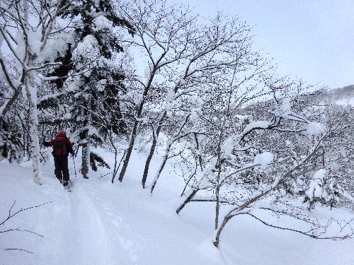同じ山岳会の方から正月早々にメッセージが来ました。「富良野のジャイアント尾根に行きましょう!」ところが,集まってみると,北広島から来ることになっていた方が,体調不良で不参加となってしまったのです。同じ旭川在住の同行者が「別に富良野方面じゃなくてもいいんだよね。スキーができれば。」と,おっしゃったので,幌加内に向かうことにしたのでした。登山口になる幌加内トンネル入口の駐車帯では,1月とは思えないくらいの暖かさでした。手袋しなくても手が凍えないのは,北海道では信じられません。駐車帯では,札幌から来たもう1パーティーがいました。私たちもそのパーティーの後を追っかけて出発です。年末年始の入山者のトレースがまだ残っていて,ラッセルも必要ありません。ただし,私のスキーの金具の調子が悪く,靴がグラグラ動いてしまいます。きつめ直したりしながら登っていくと,徐々に風が吹いてきて,山頂付近では強風でした。同行者は,「私は行かなくてもいいんだよ」といっていましたが,私は行く方に1票。結局,風で大変な山頂に登りました。下りで,途中の斜面を滑ることになりました。真っ白で,シュプールのないきれいな斜面はこれ以上ない楽しさです。少し金具のがたつきを気にしながらですが,何度か転びながらも楽しく滑ることができました。ここから尾根に登り直しですが,同行の方はもう1本滑るたいということで,私はゆっくり登ることにしました。急斜面を登ると靴がすねに当たって痛いので,できるだけキックターンで斜めに登っていきます。上まで登ってシールをはがしているところで合流し,あとは滑るだけです。吹きだまりに突っ込んで,助け出されるというハプニングもありましたが,楽しいスキーをすることができました。同じ市内にいるので,またいろんなところへ行けそうです。今回は,スキーを積む関係でミニバンで行きましたが,帰ってから早速メルカリでスキーキャリアを購入しました。また,本日スキーの金具を見てもらおうと秀岳荘へ行ってみたら,「寿命ですね」といわれ,金具の購入も決心しました。30年ほど使ってきたジルブレッタ404ともお別れです。(涙)